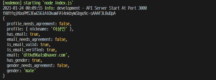 서버를 구동하고 로그인하면 아래 사진처럼 콘솔에 access token