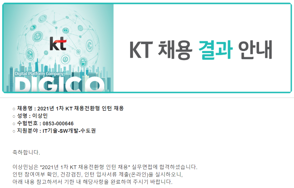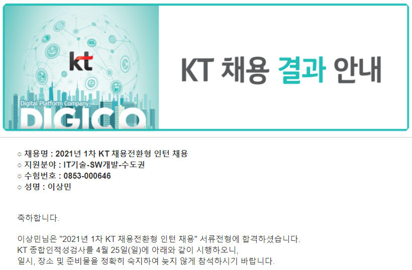 상반기 지원한 회사 중 전형 과정에 인적성이 포함된 기업은 KT가 유일했다. 가비아 같은 경우 인적성을 보긴 했지만 합불을 가리지 않고 면접을 위한 참고용으로 봤었다.