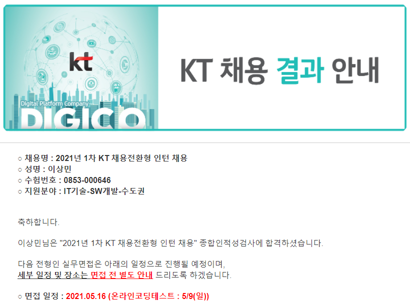 면접은 광화문 사옥에서 진행했다. 사옥으로 부르길래 대면 면접일 줄 알았는데 화상 면접이었다. KT는 채용 전 과정이 블라인드기 때문에 이름 대신 숫자 명찰을 가슴에 달고 들어갔다.