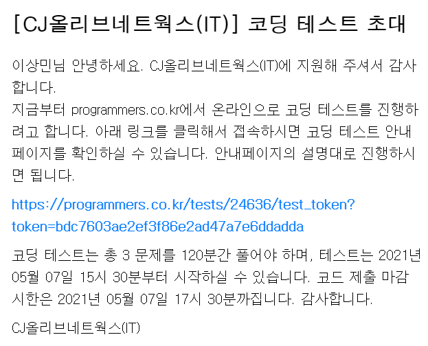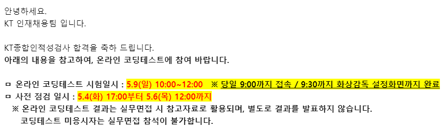 KT는 인적성 시험을 따로 봤기 때문에 코테를 보지 않을 줄 알았다. 합불 여부를 따로 알려주지 않고 16일에 있을 면접 시 참고자료로 활용된다고 한다.