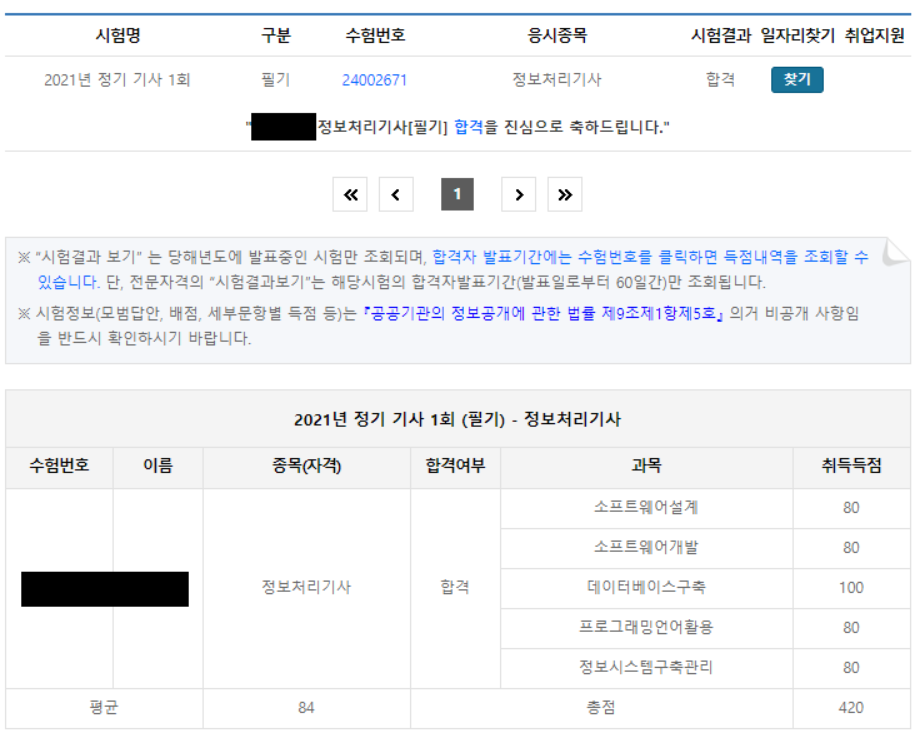 생각보다 좋은 점수로 합격해서 깜짝 놀랐다. 2주 정도 공부했으나 당시에 외주를 진행하고 있어 실질적인 공부 시간은 열흘 채 안됐던 것 같다. 시나공 책을 한 번 보고 개정 이후 기출을 세 번씩 풀었다. 오히려 시험 직전까지 기출만 팠던 게 도움되지 않았나 싶다.