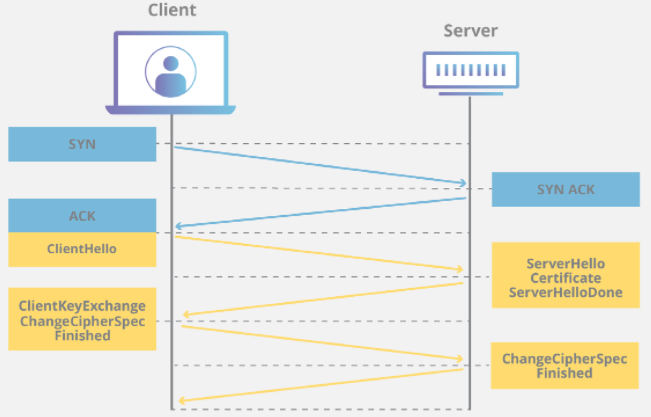 HTTPS도 TCP 기반의 프로토콜이기 때문에 위 사진에서 파란색으로 표시된 것처럼 3-way handshake 과정을 통해 가상 연결을 확립한 후 SSL handshake 과정이 이루어진다.